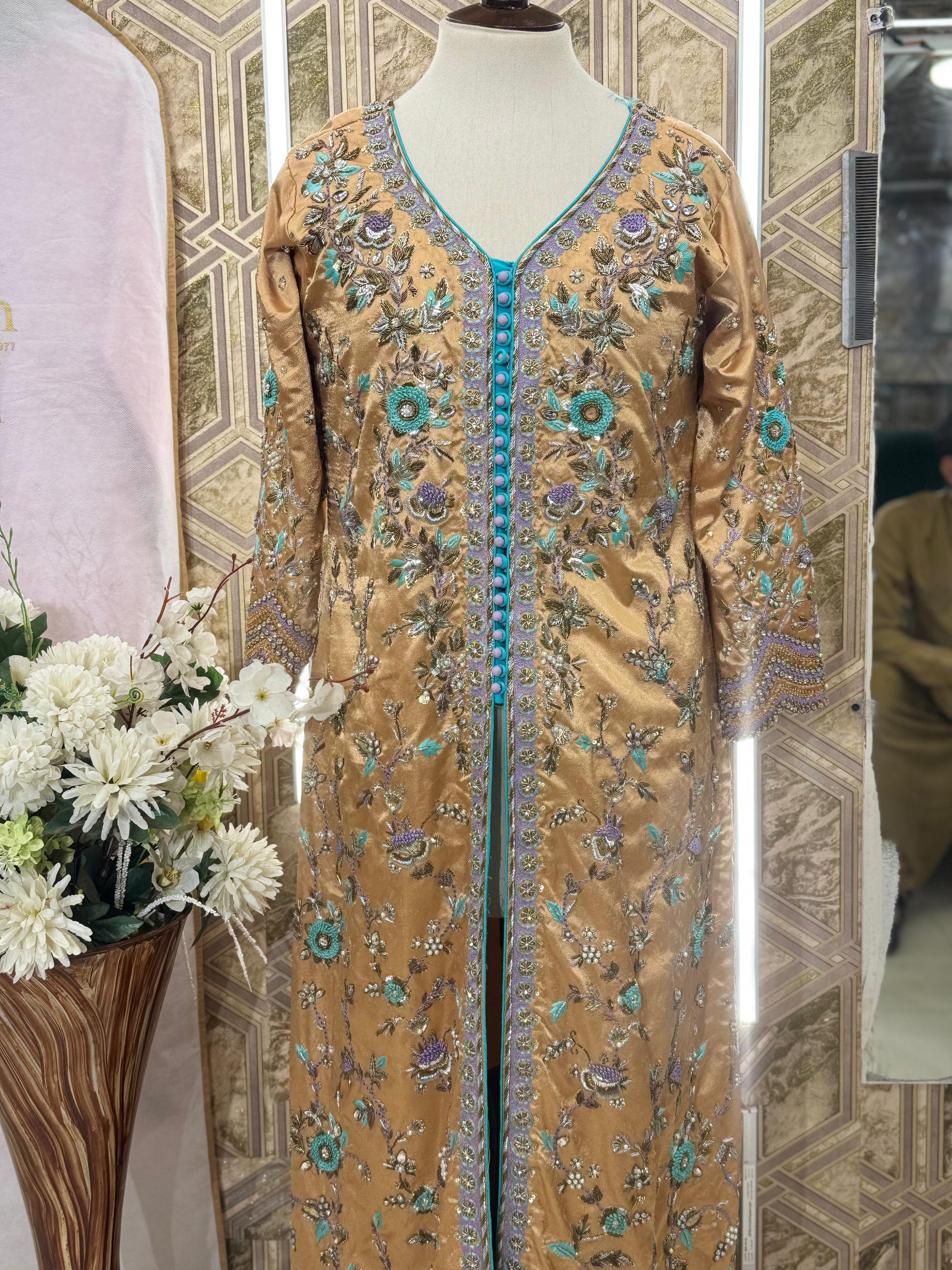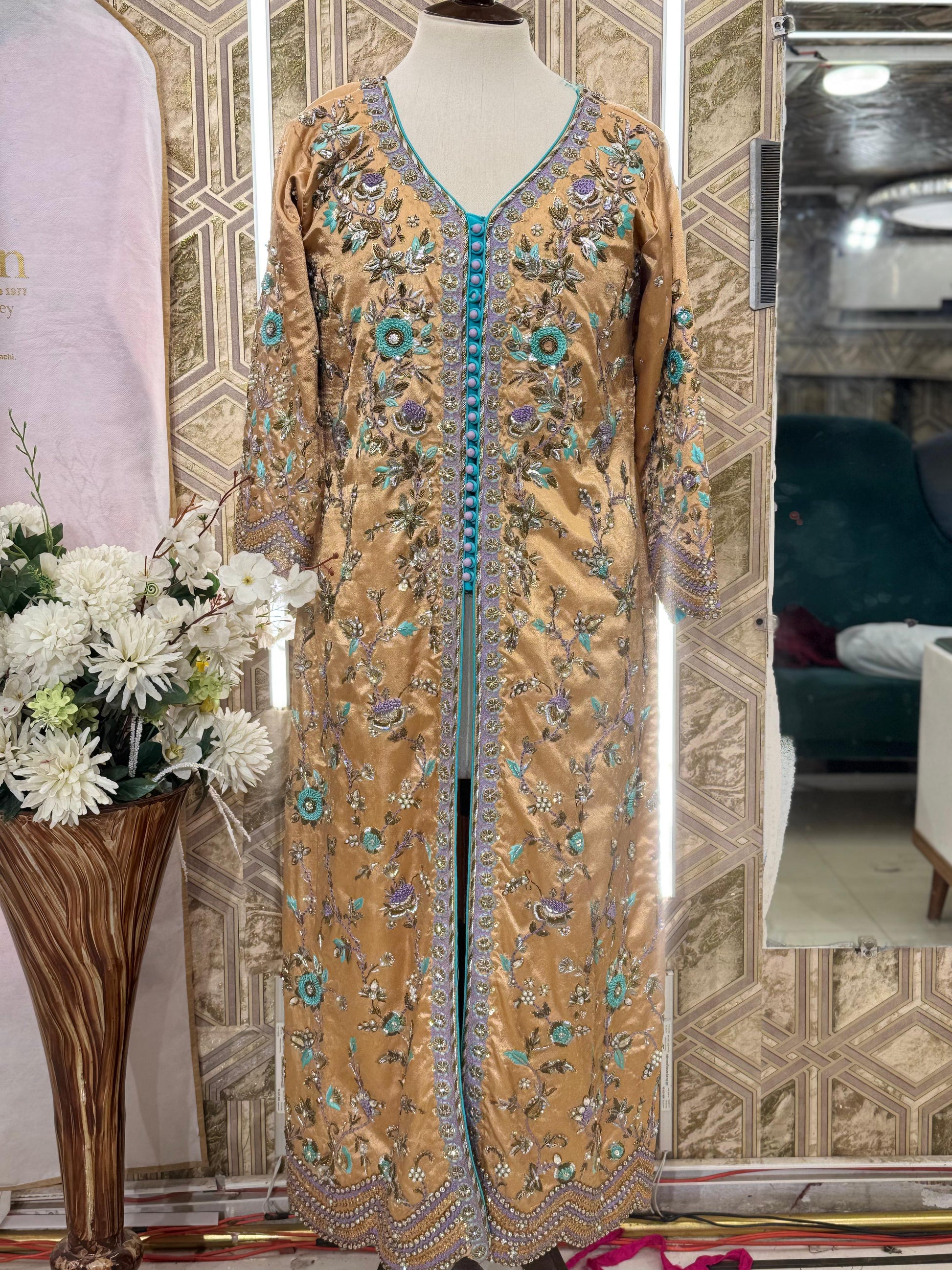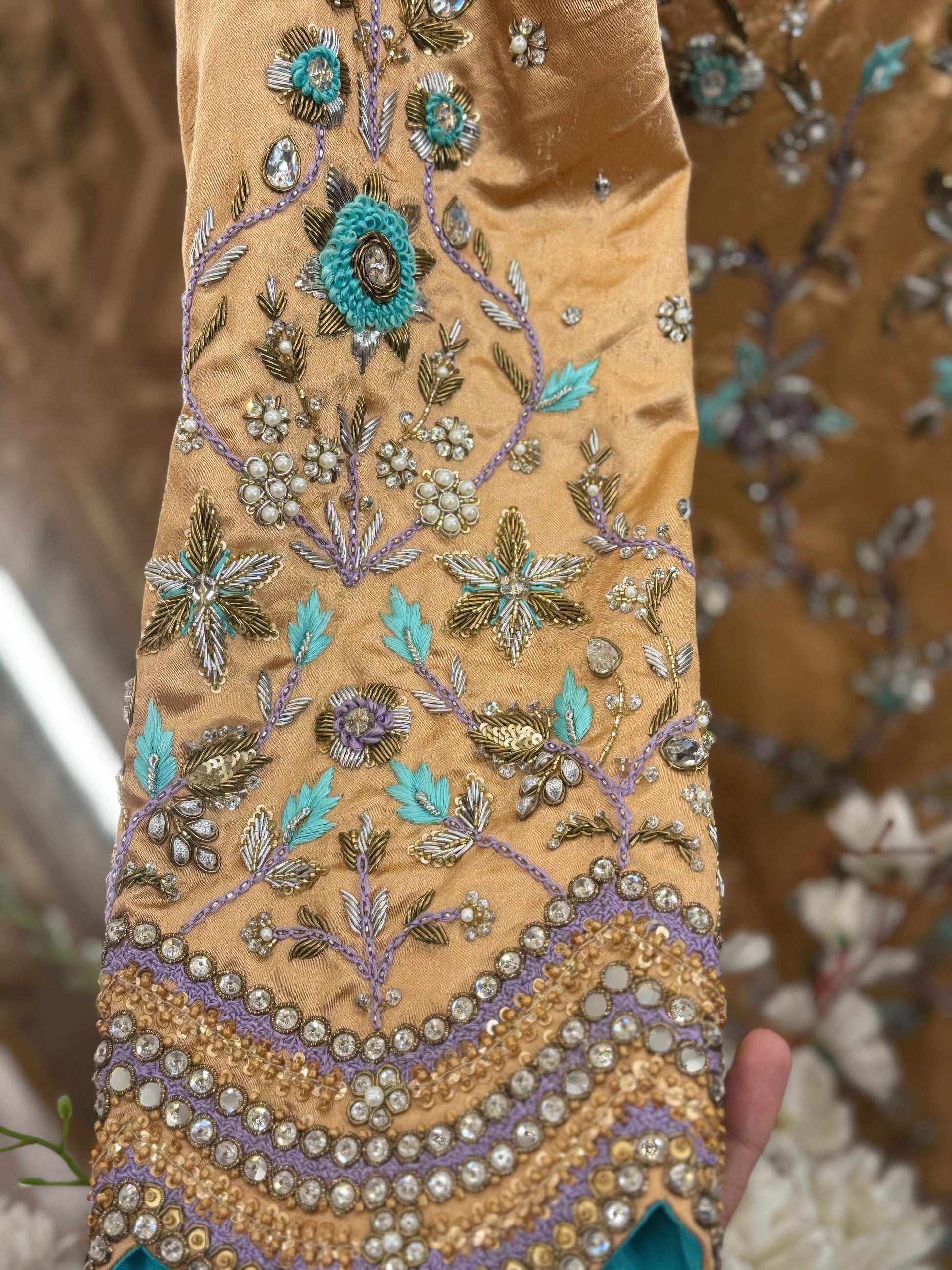 A statement of elegance, this sand gold bridesmaid partywear dress is crafted from premium shamos silk and adorned with pure Zardozi, kacha work, and delicate thread embroidery handwork. The soft golden tone radiates grace and sophistication, making it a perfect choice for weddings, festive gatherings, and Occasions.
