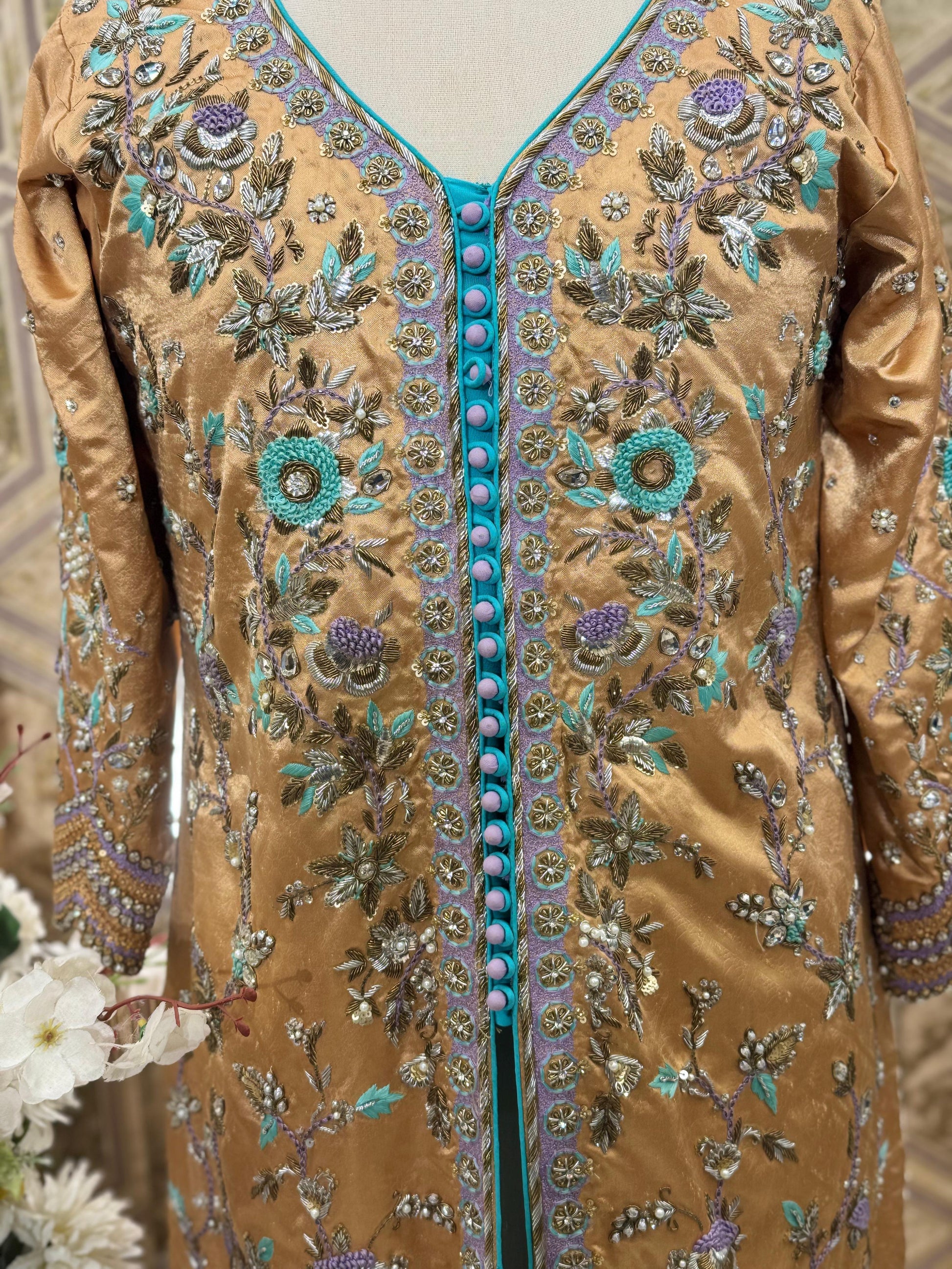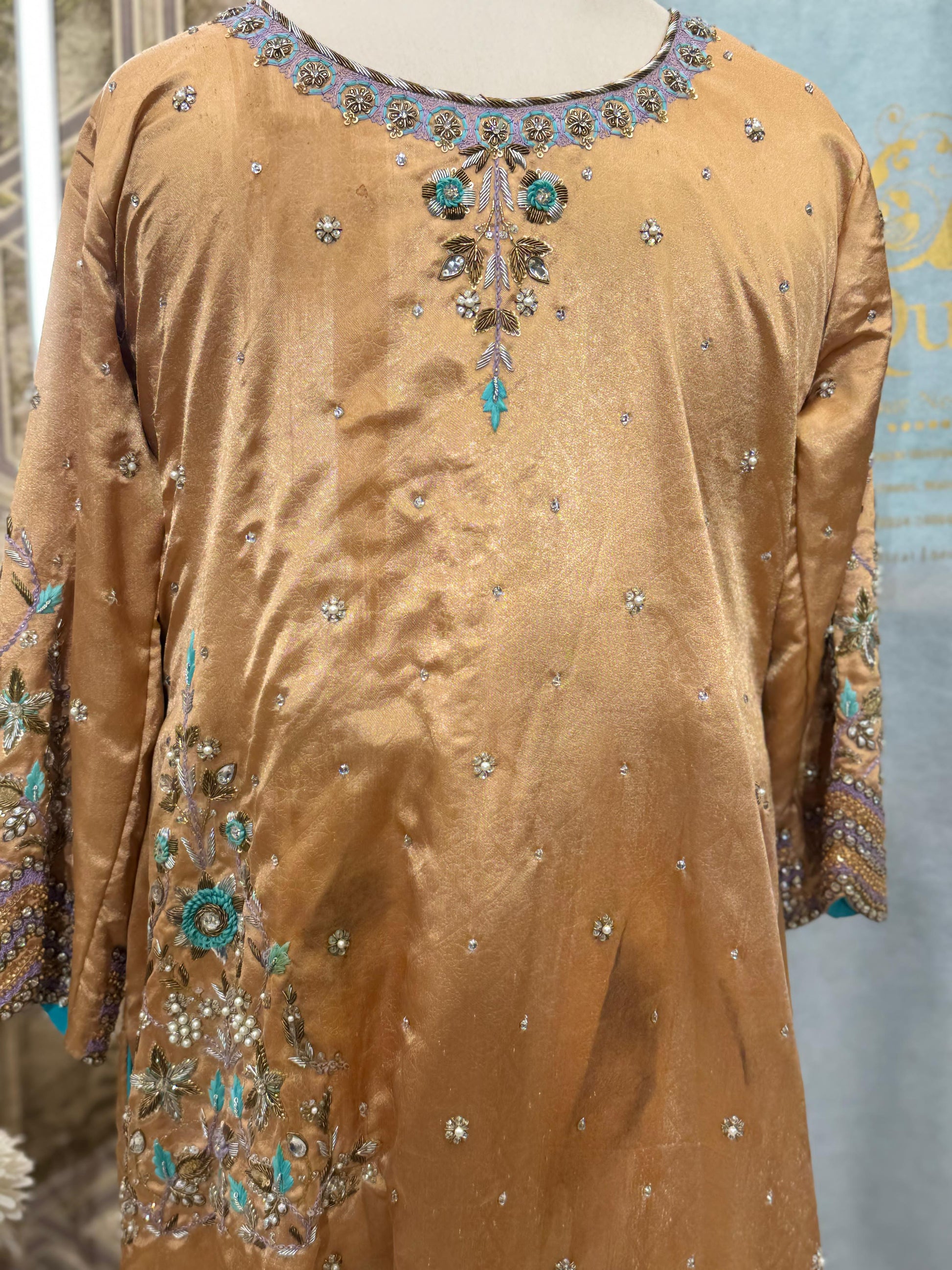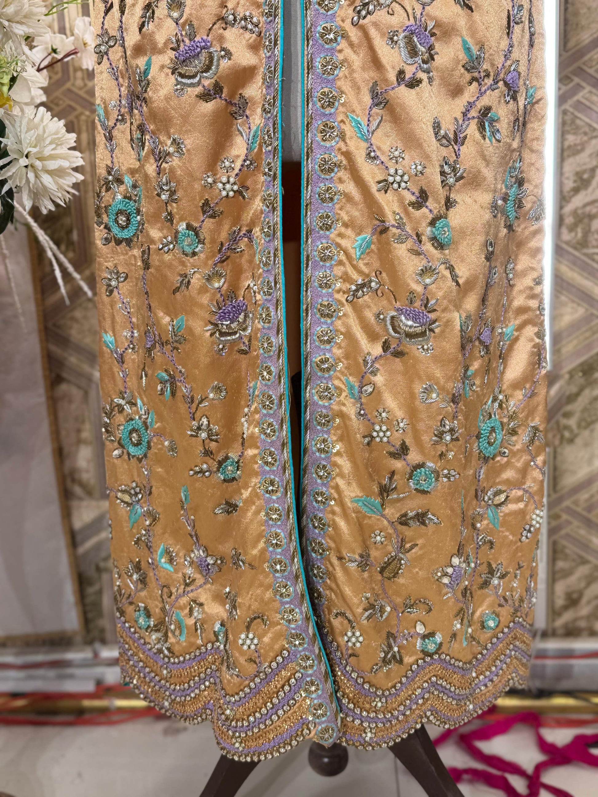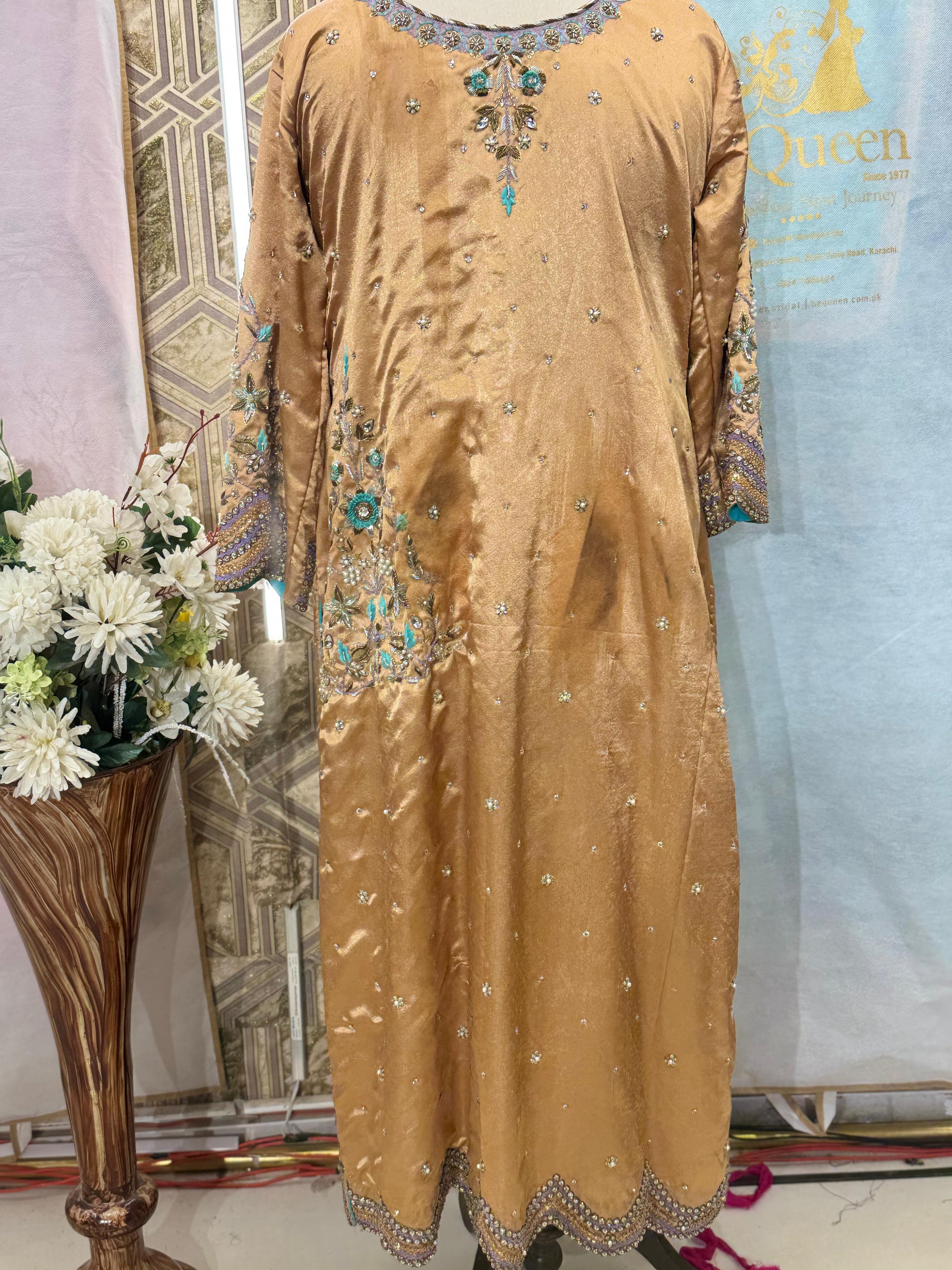 A statement of elegance, this sand gold bridesmaid partywear dress is crafted from premium shamos silk and adorned with pure Zardozi, kacha work, and delicate thread embroidery handwork. The soft golden tone radiates grace and sophistication, making it a perfect choice for weddings, festive gatherings, and Occasions.