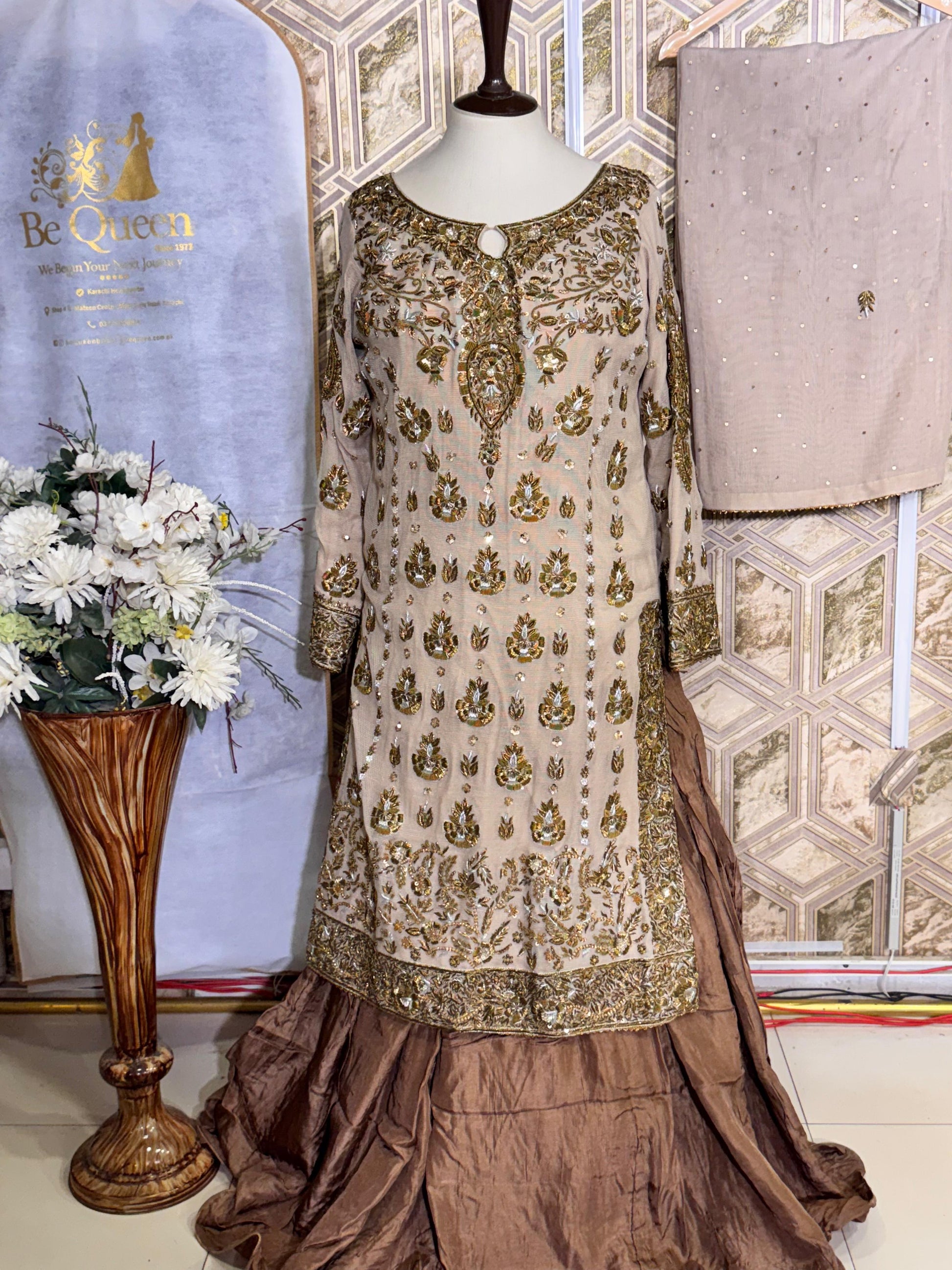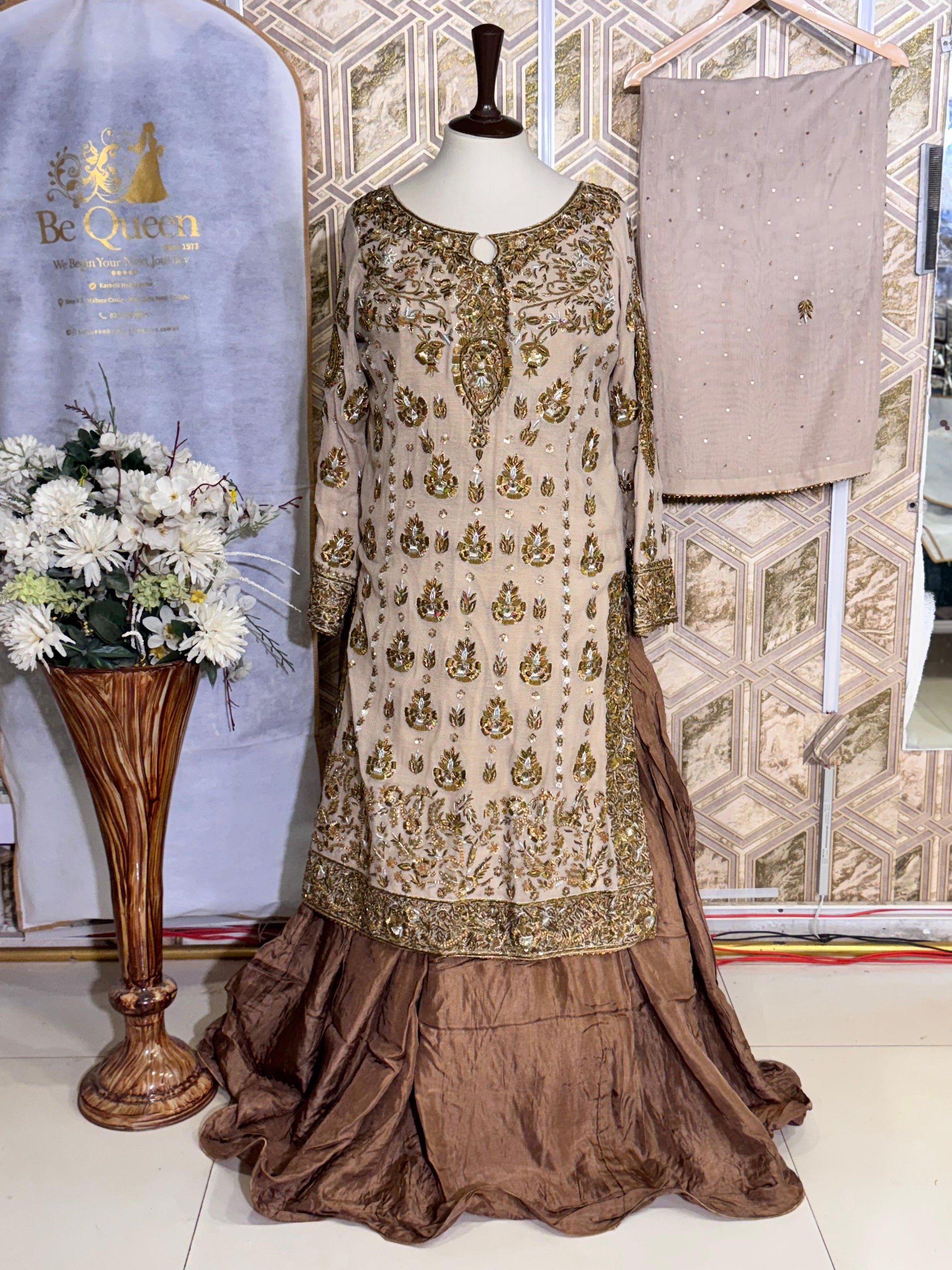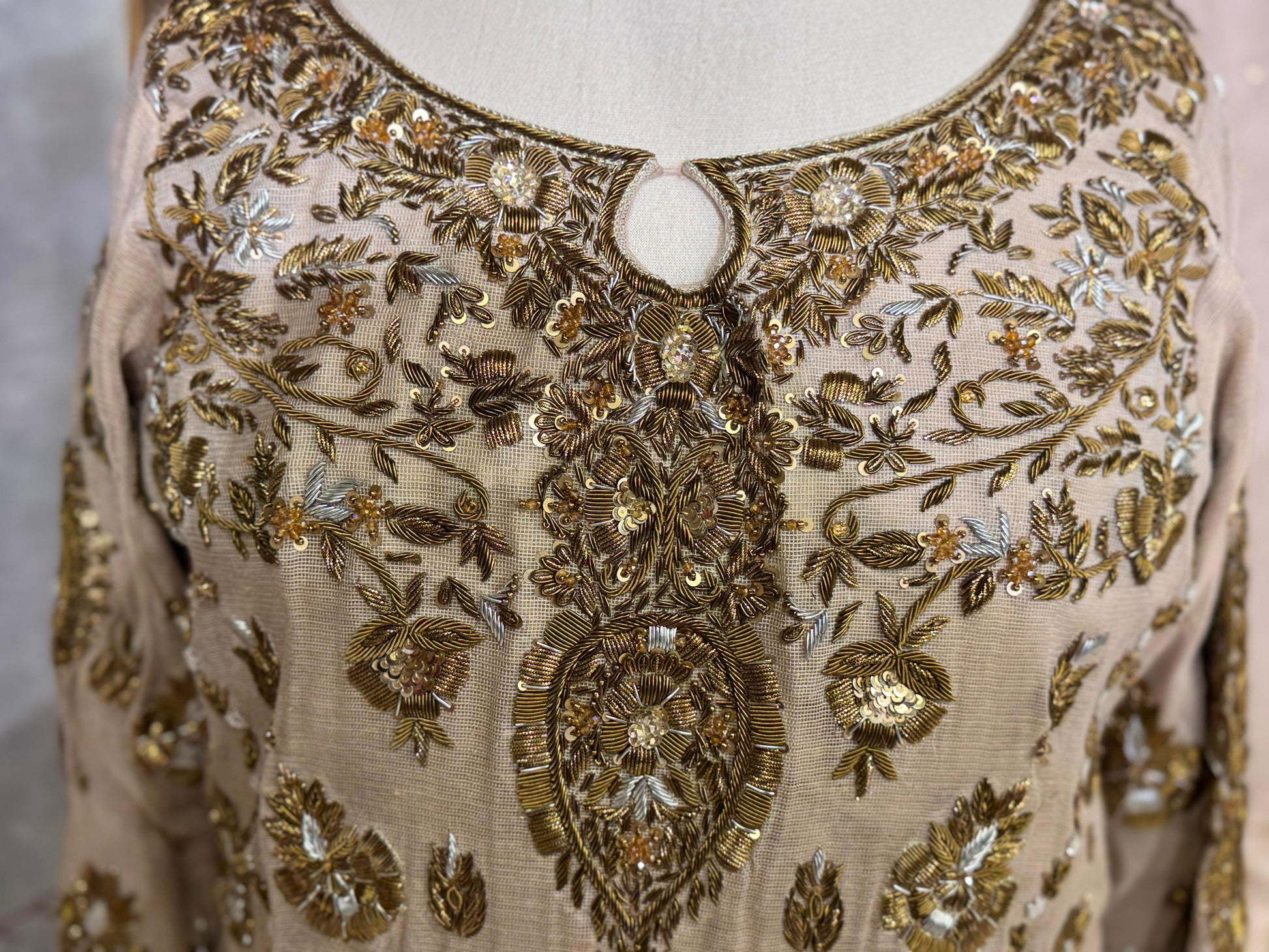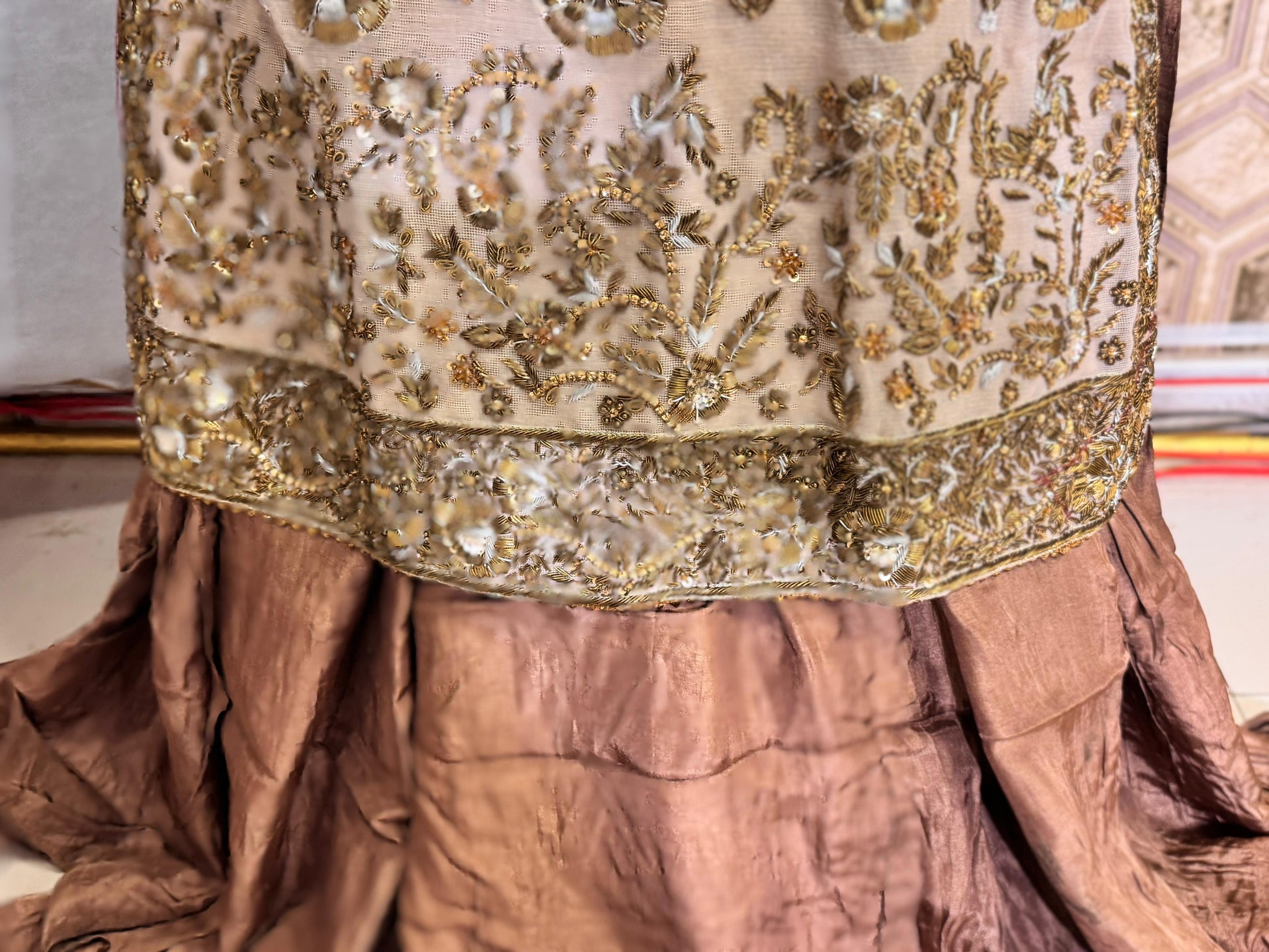 ✨Made from rich khadi net, this piece is adorned with antique gold handmade embroidery, creating a regal charm that captures every eye in the room.This ensemble is a perfect choice for weddings, formal events, or Occasions.