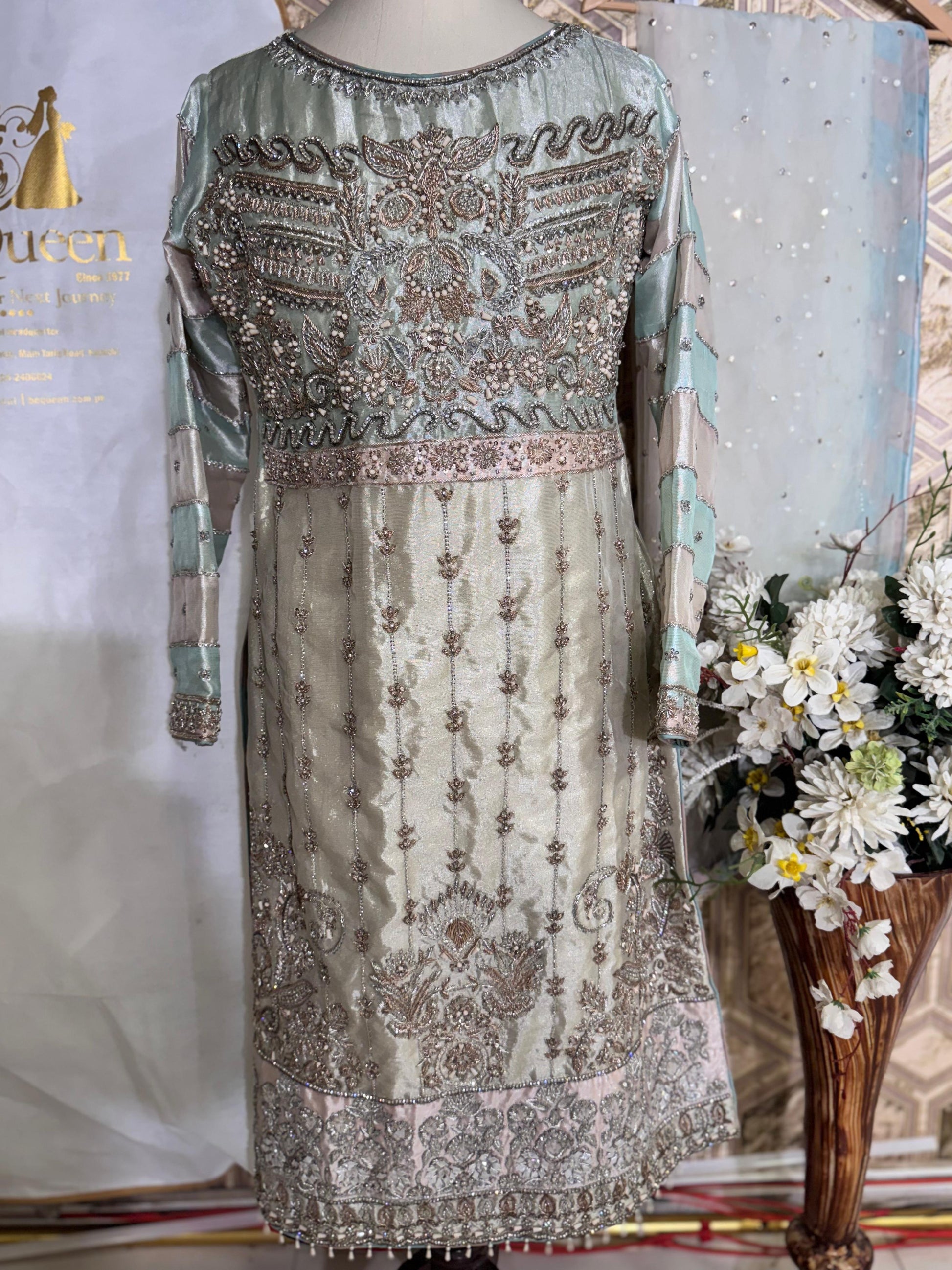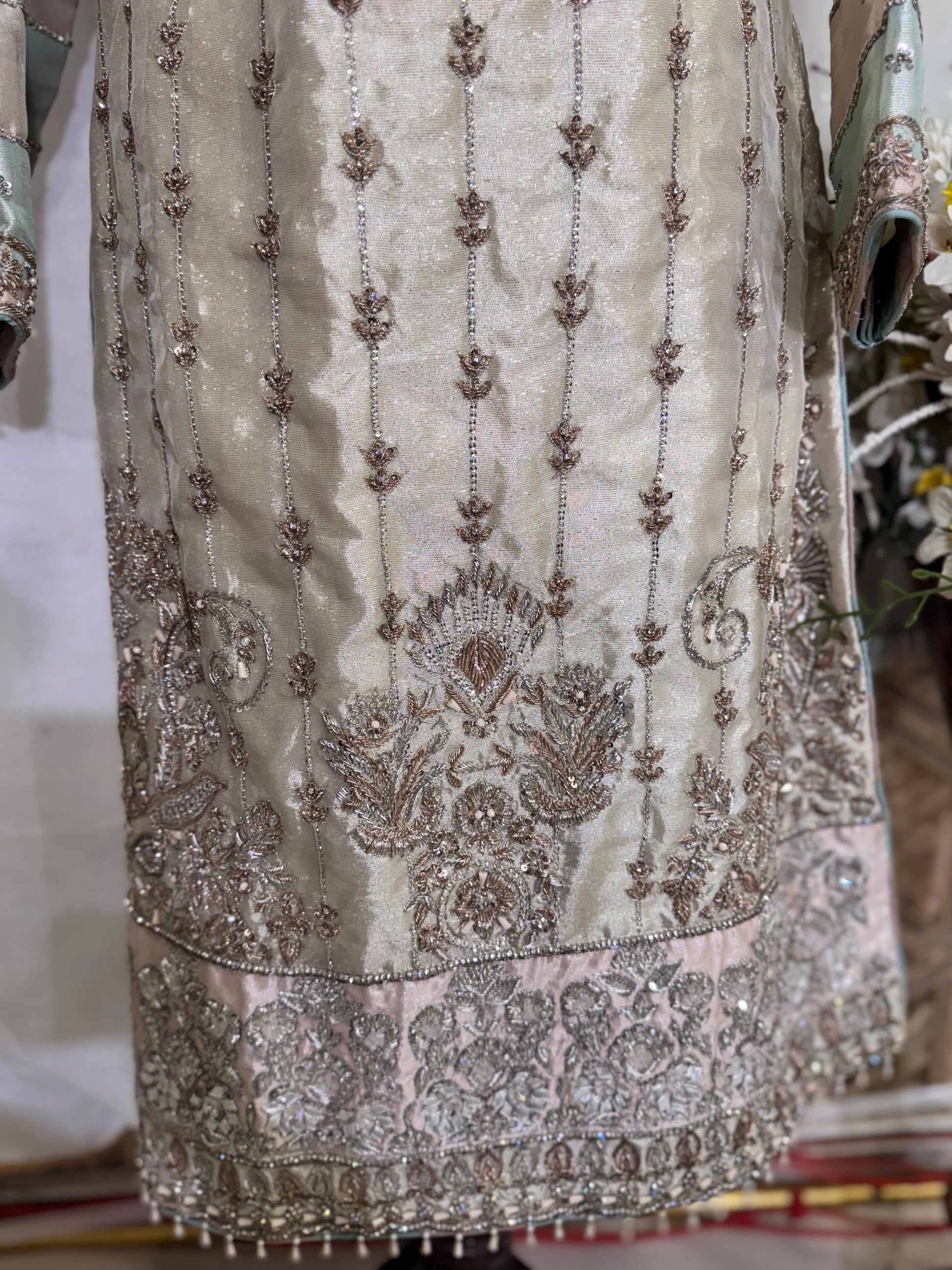 Embellished with mixed embroidery — from sparkling sequins to delicate stone diametrics — this piece captures the essence of royal sophistication. The subtle shine of silk paired with graceful embellishments makes it a perfect choice for Any Wedding Events & Occasions.