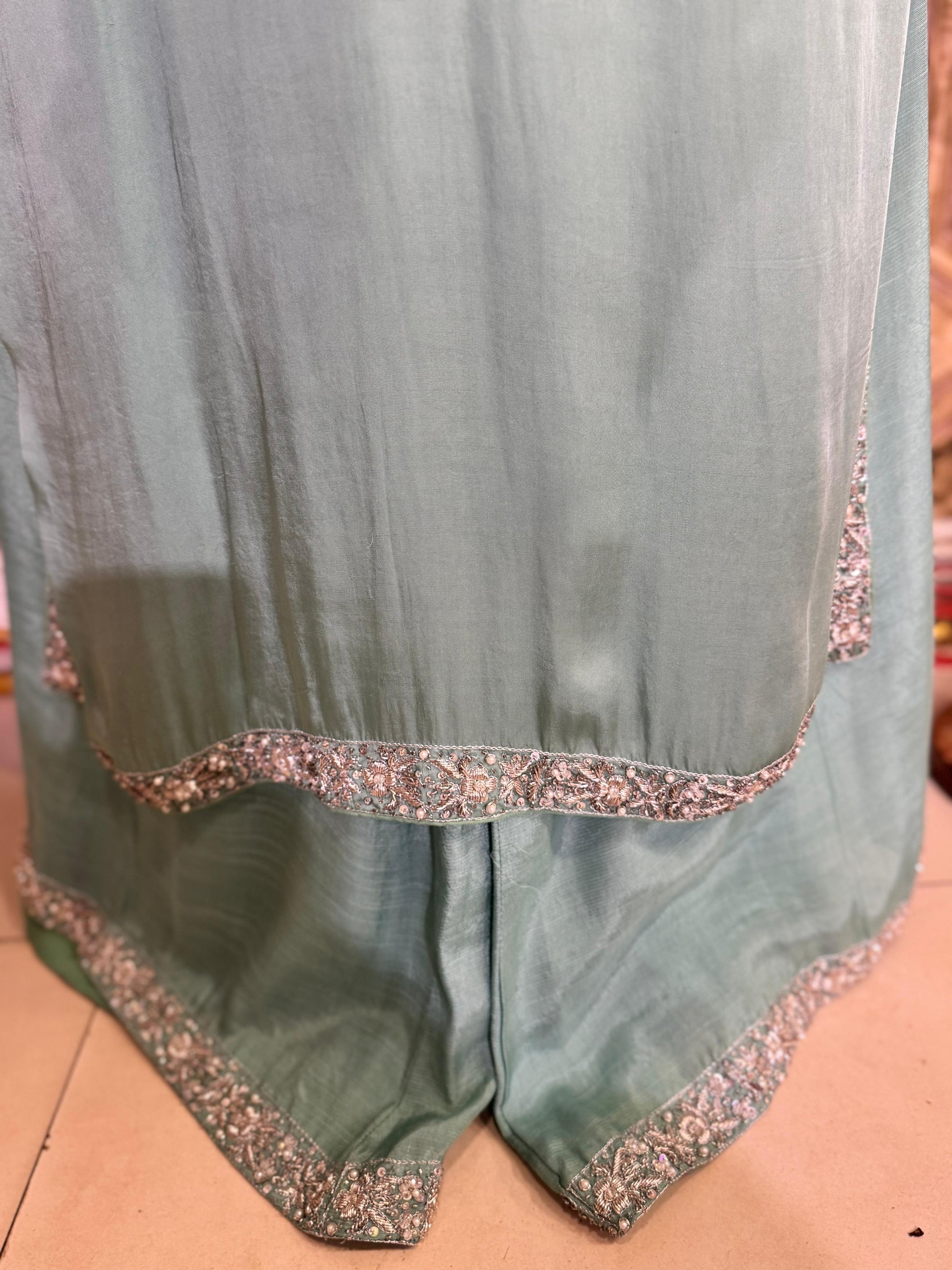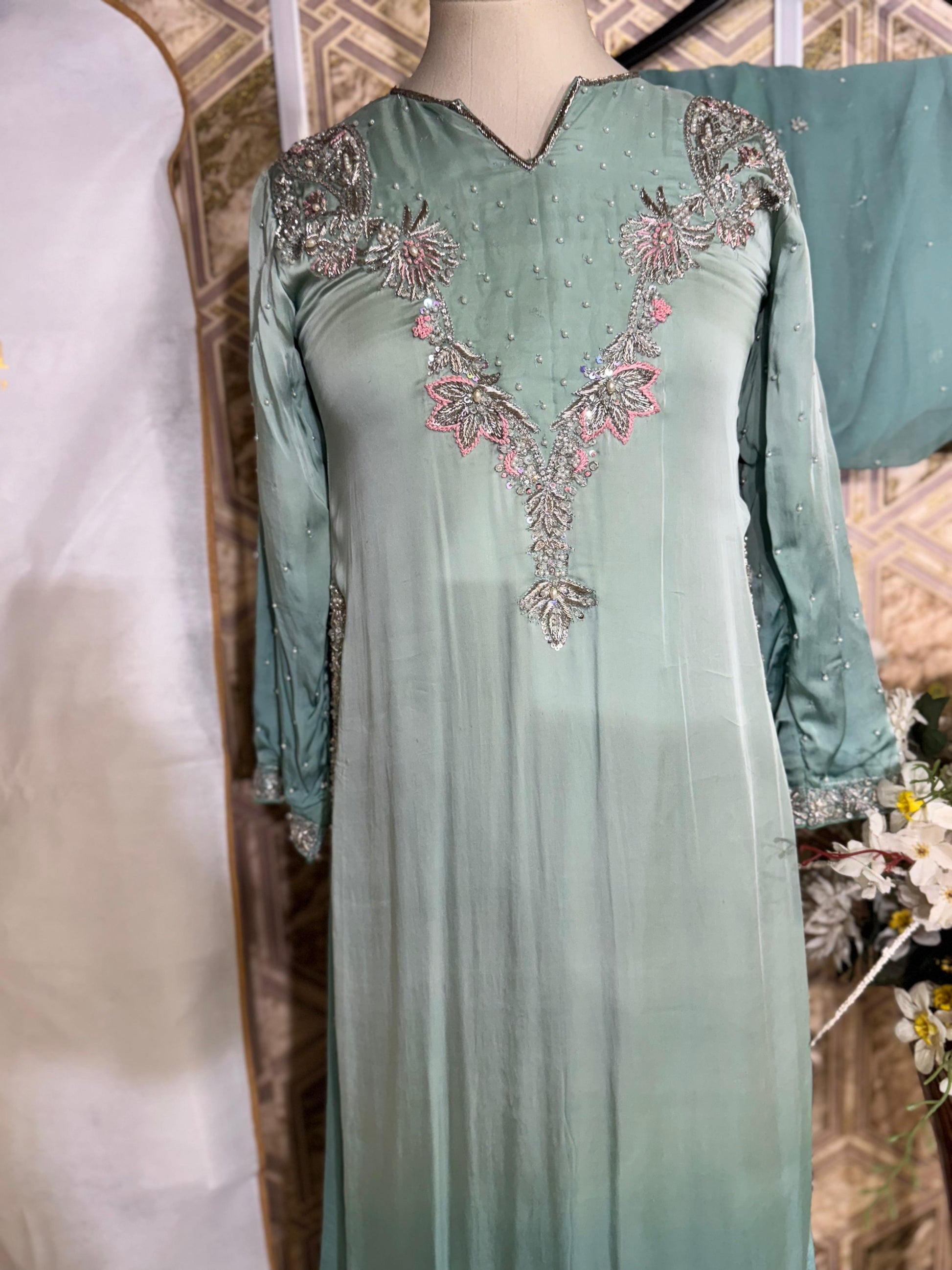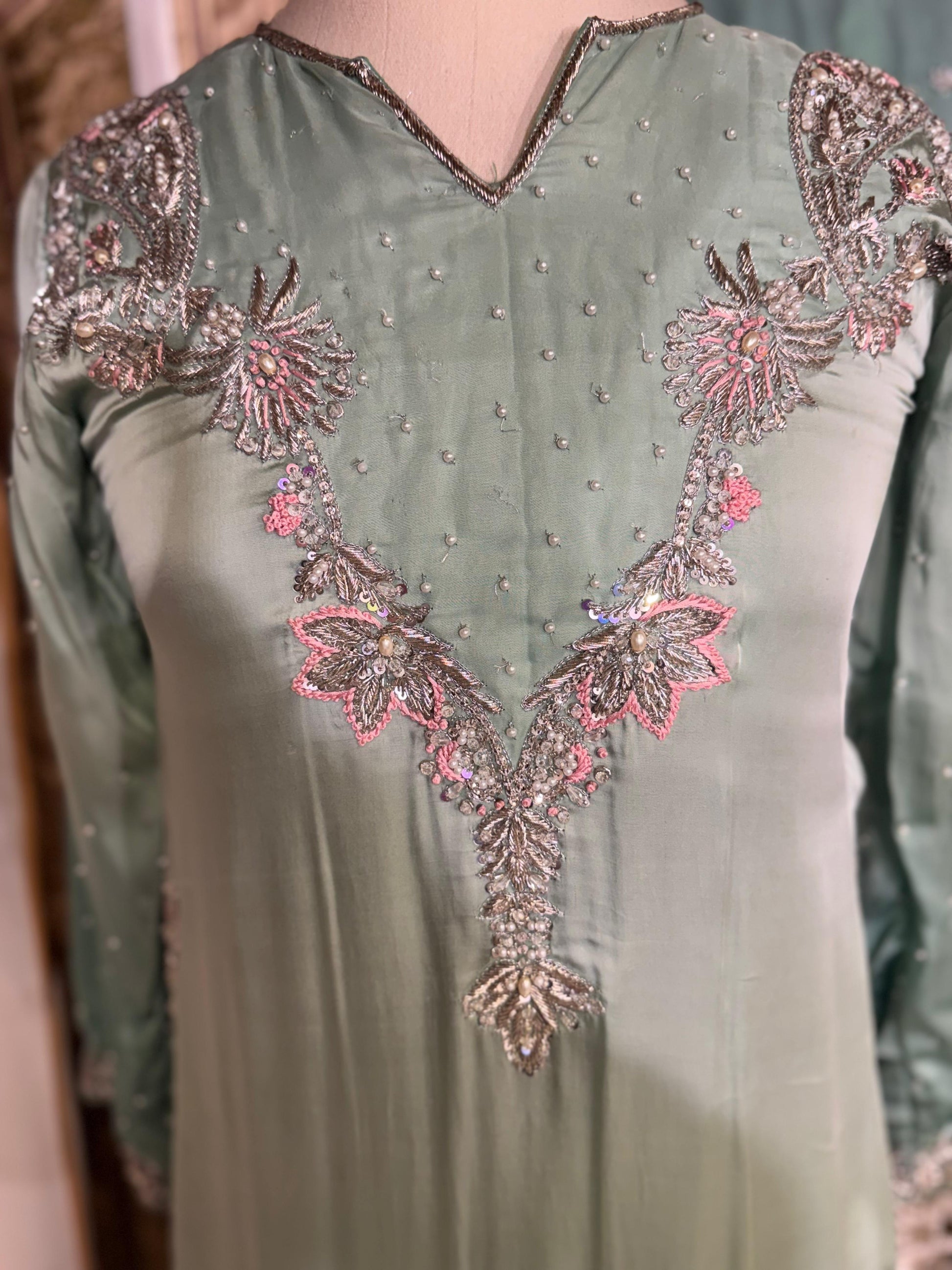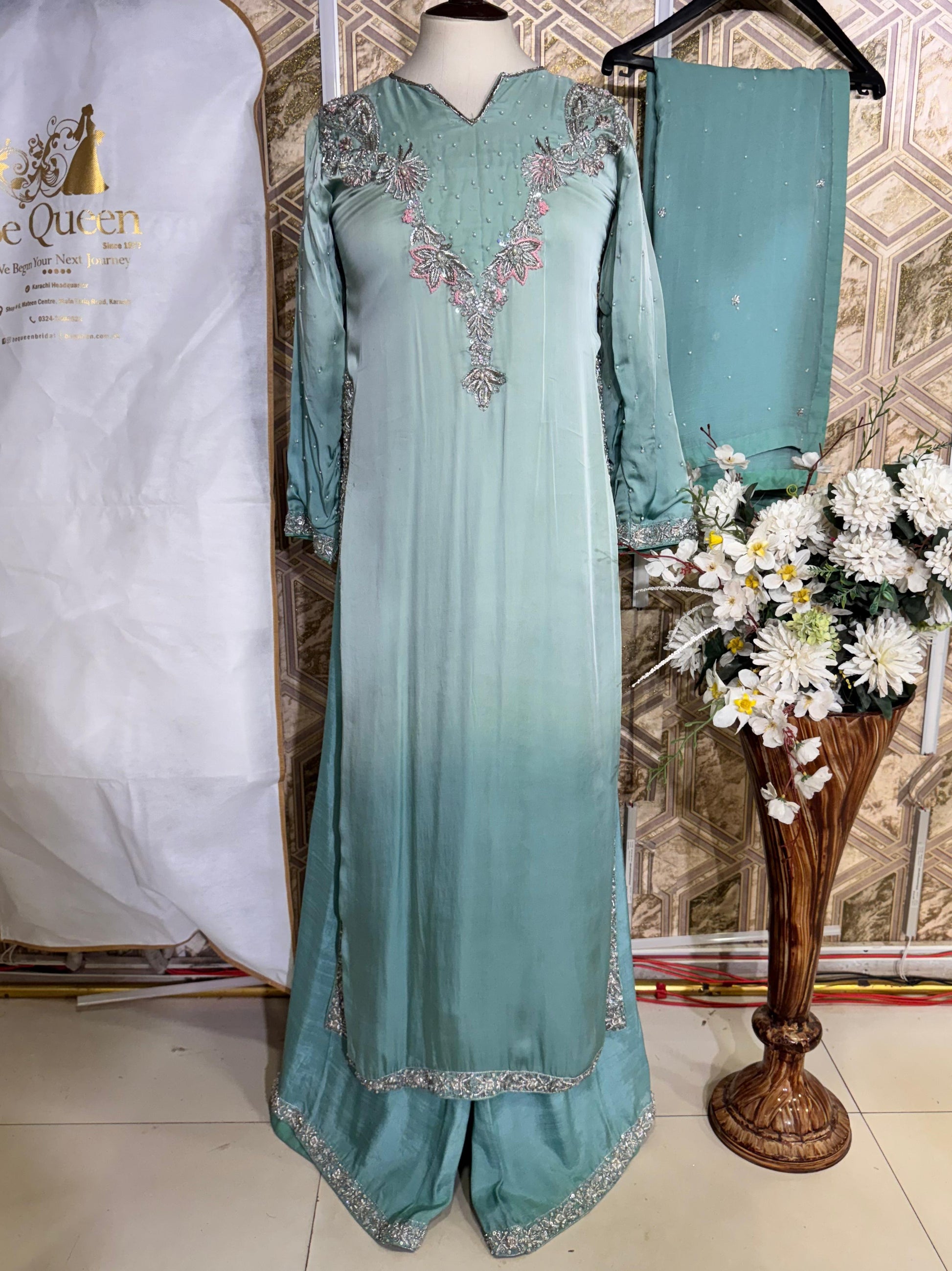 Adorned with mixed embroidery, including shimmering sequins, elegant stone diametrics, and fine thread work, it’s a perfect ensemble for Wedding events. The shine of silk and subtle sparkle of handwork create a look that's fresh, festive, and unforgettable.