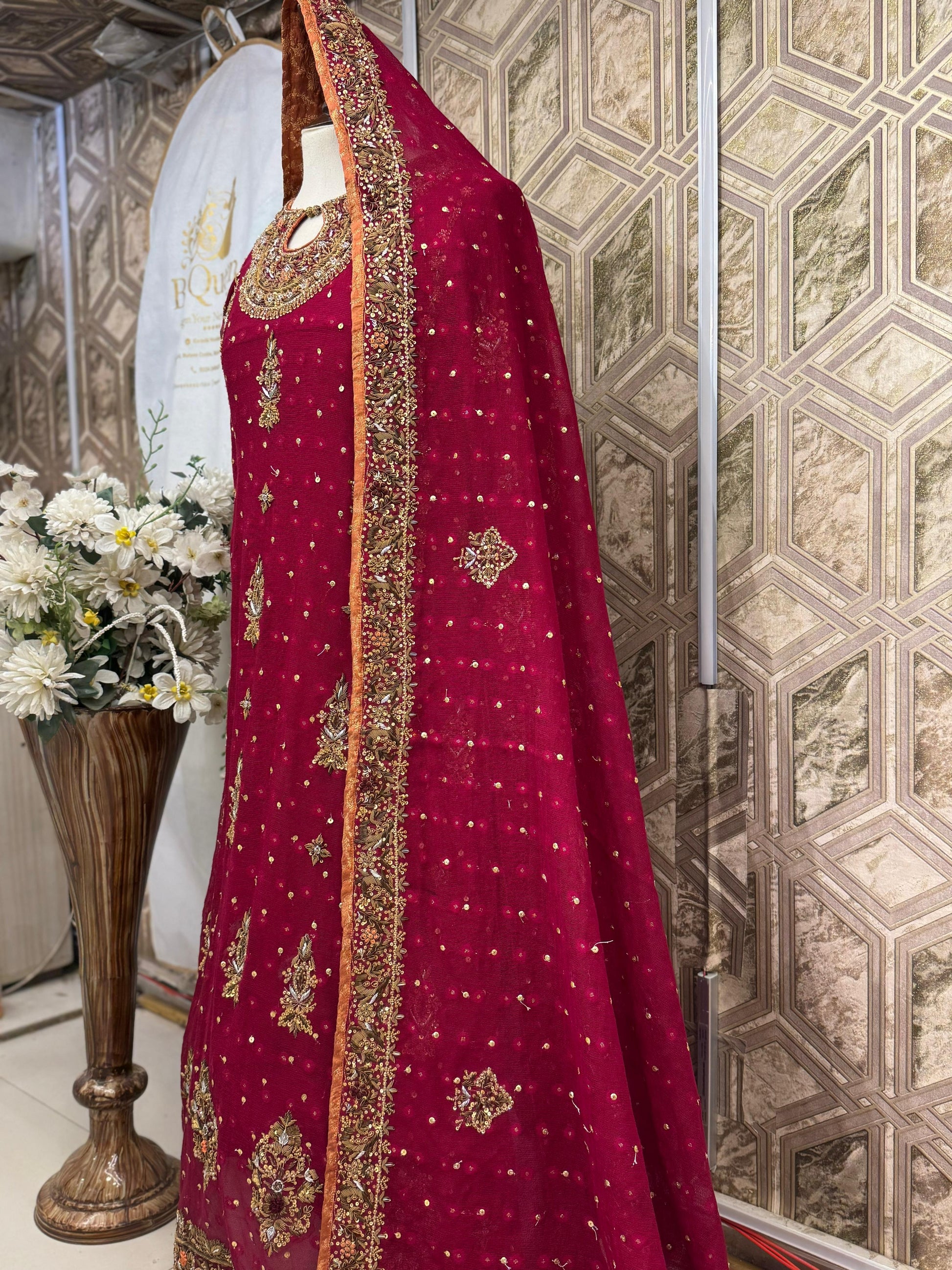 The deep ruby red shade symbolizes love, power, and celebration, handmade which adds a touch of royal tradition. This dress is designed to make u stand out at Wedding Events & any other occasions.