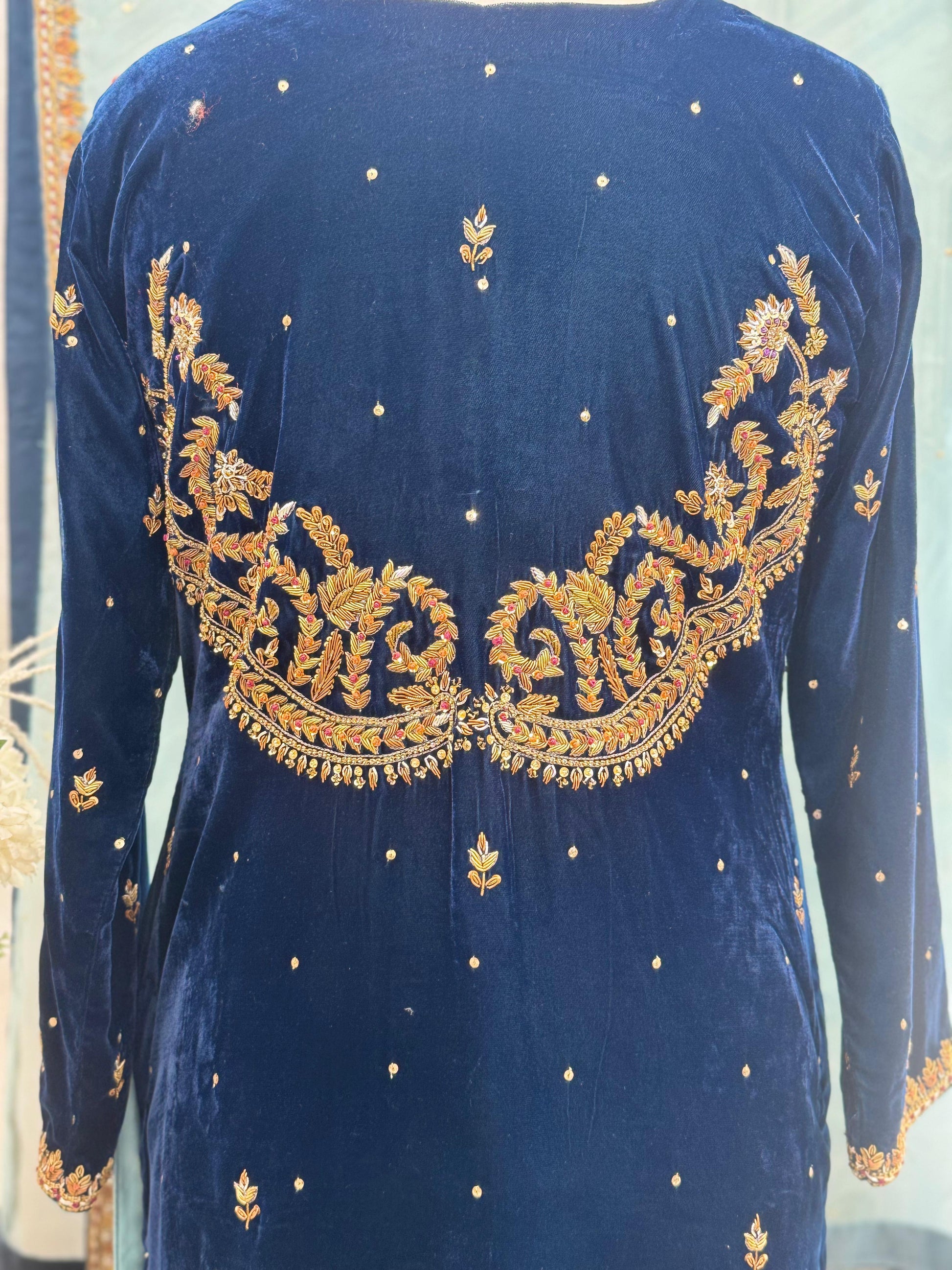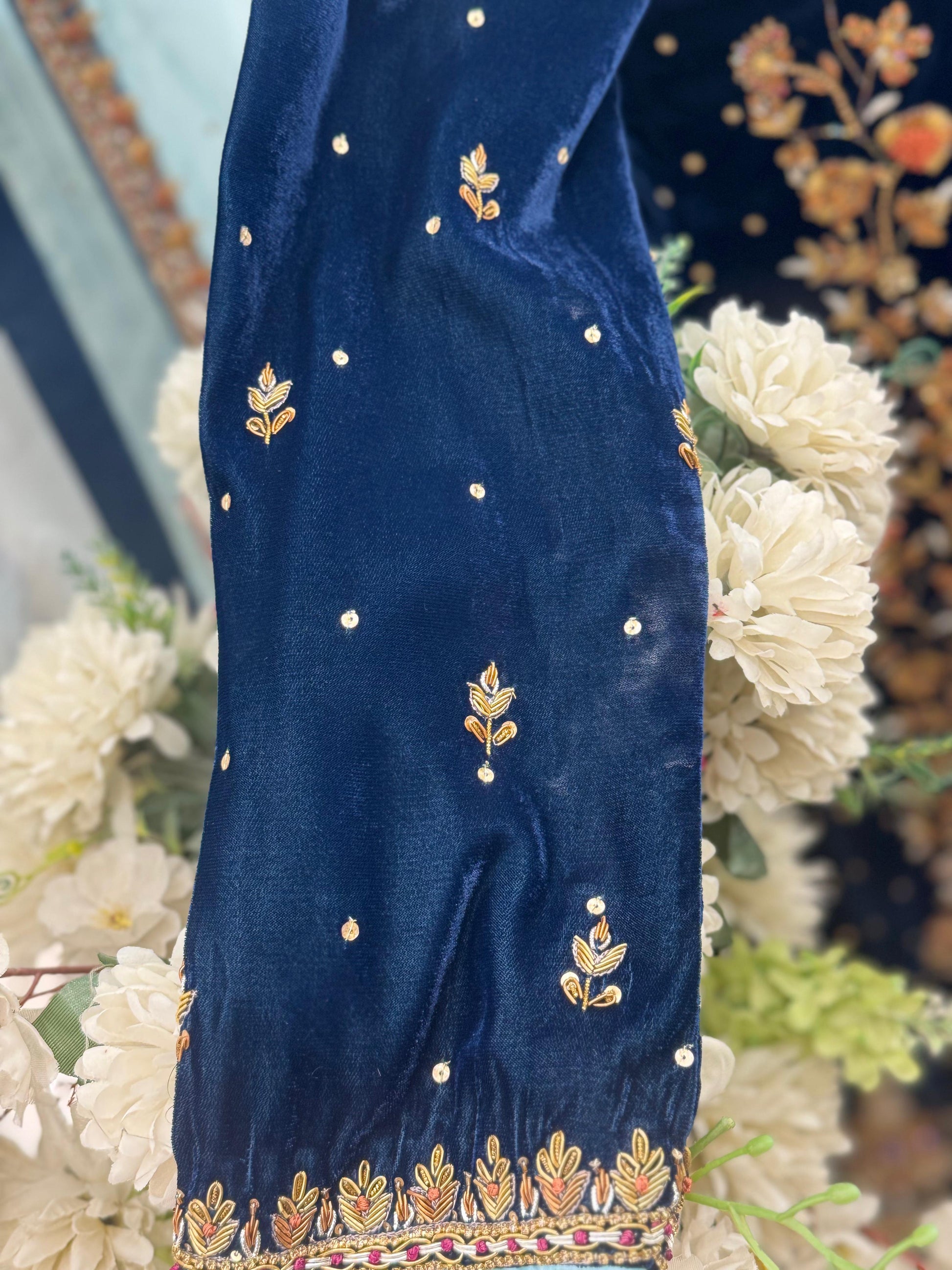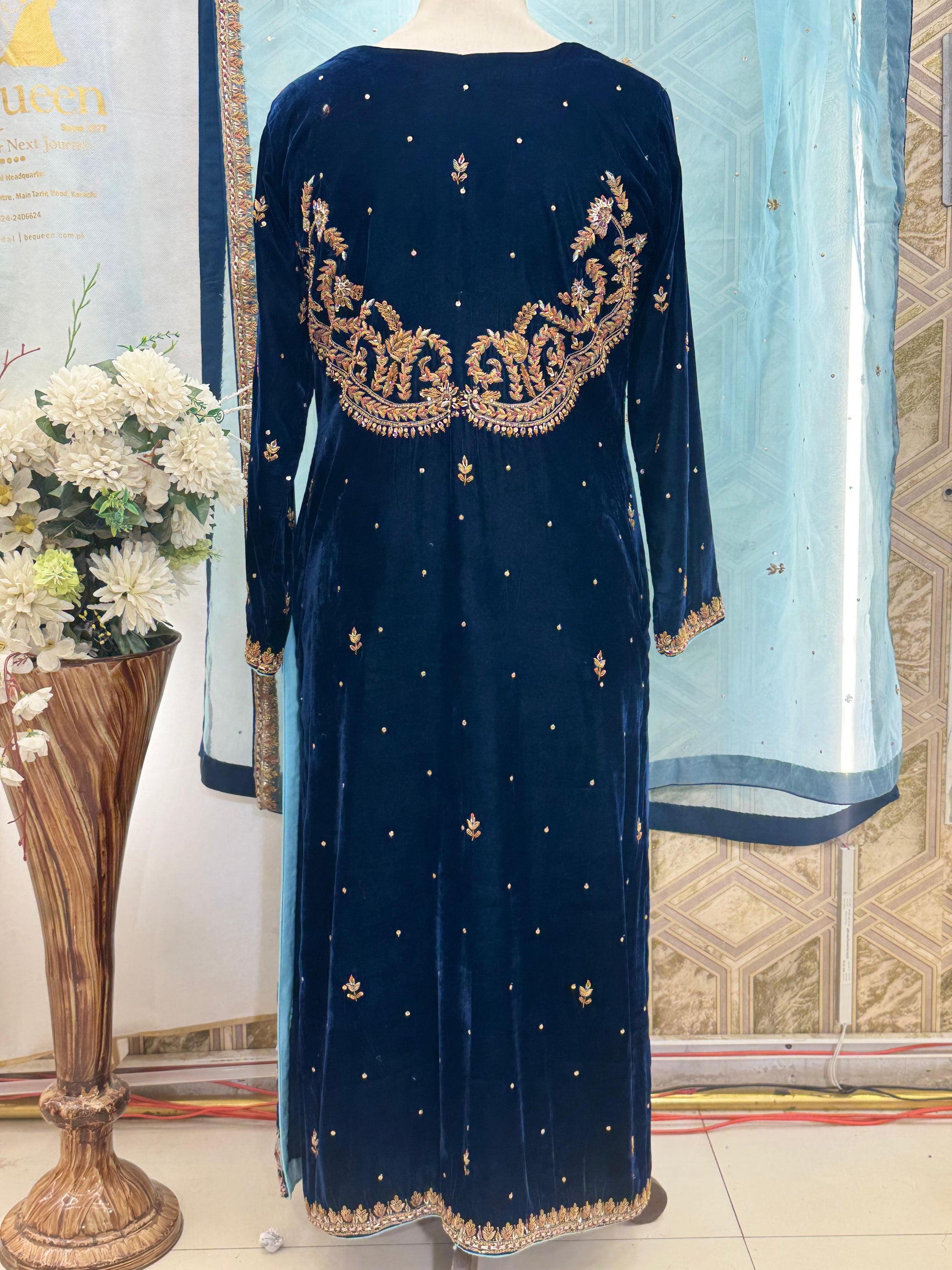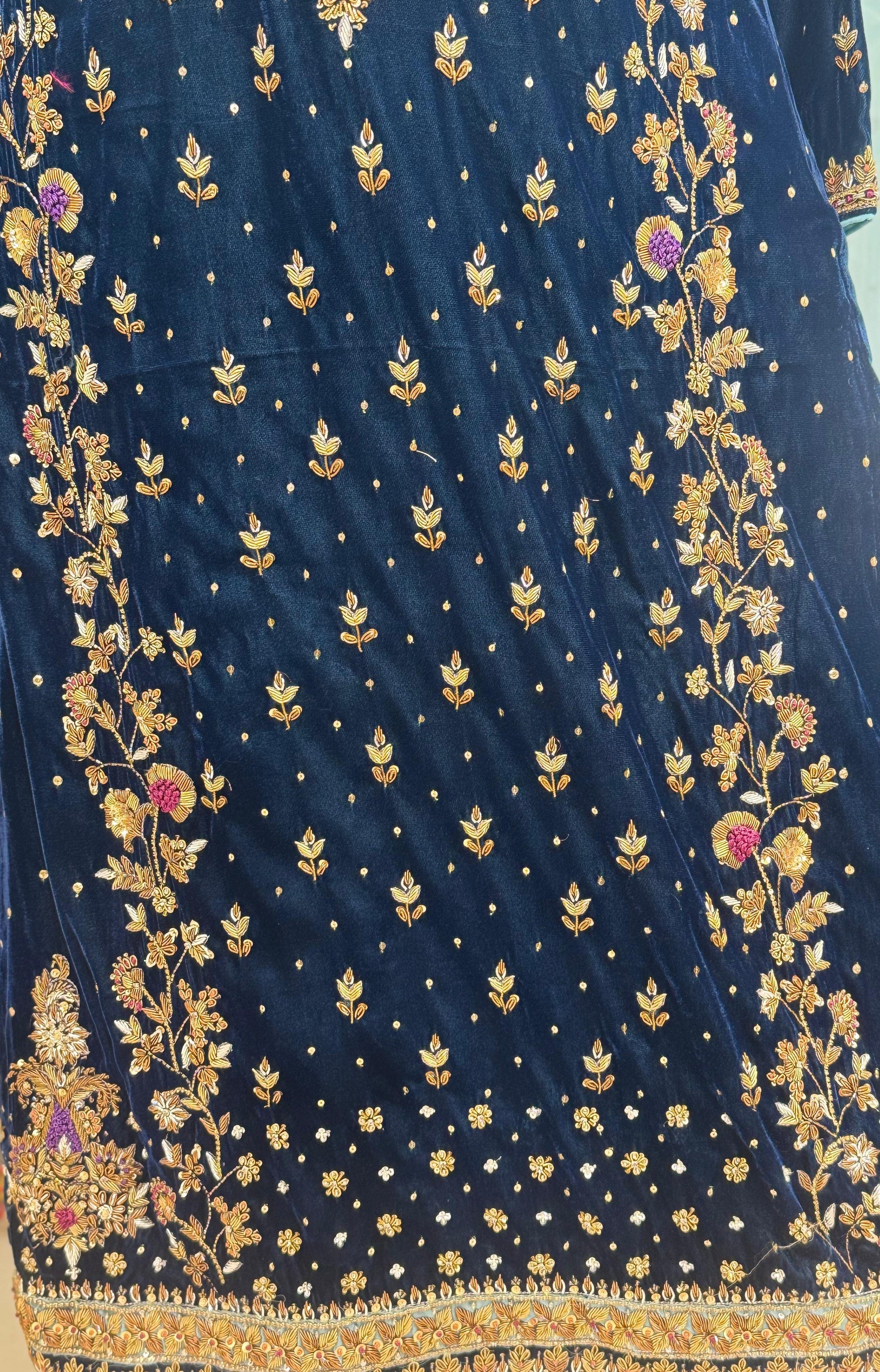 Step into royal elegance with our Regal Teal, a luxurious teal blue velvet bridesmaid dress adorned with pure Zardozi antique gold work and intricate Resham embroidery handwork. The rich jewel-toned velvet pairs beautifully with a lightweight organza dupatta.