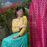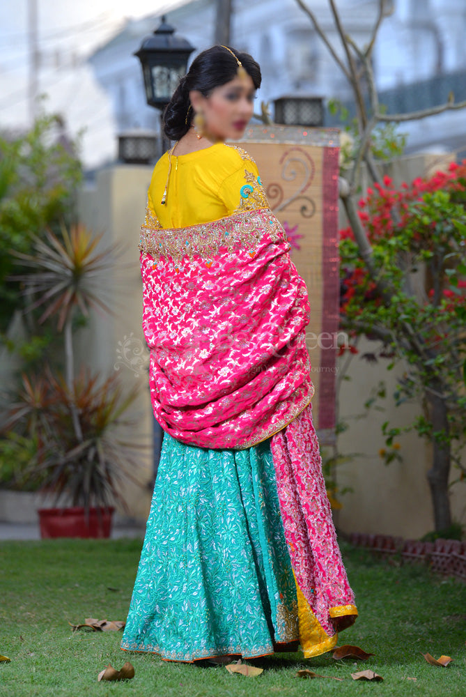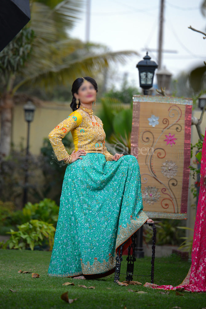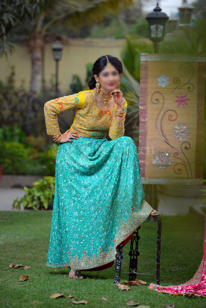 This dress is designed with a unique combination of colors by the Bequeen bridals. An exclusive dress for the ‘Qabool Hai Collection’.This turquoise lehenga with intricate details of beautiful embroidered custom-designed Resham Chiffon looks ravishing on a bride.It is paired with a yellow kurti and hot pink dupatta. The kurti has golden embroidery along with turquoise lehenga and hot pink dupatta very well.