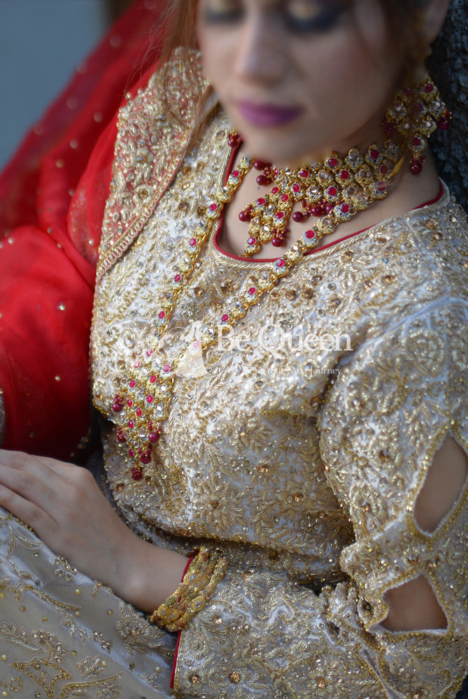 The most noticeable part of a wedding is the beauty and grace of the bride on her big day. This elegant dull gold dress with golden embroidery on pure mesuri organza fabric and red net dupatta is an absolute eye-catcher for a bride on her big day.