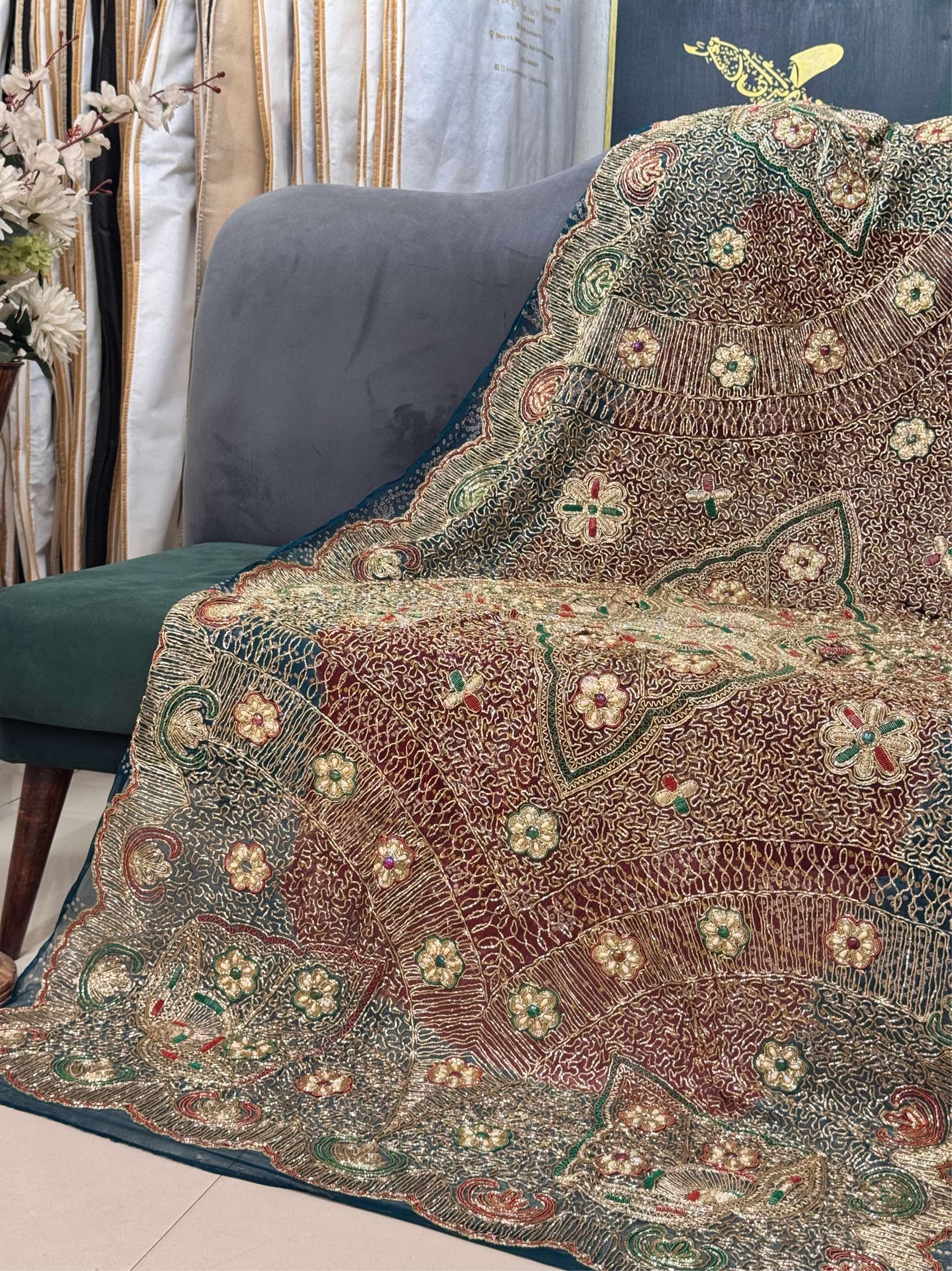 With its rich palette, royal motifs, and textured handwork, this dupatta adds a regal touch to bridal wear and holds deep sentimental value—cherished as a generational heirloom in both Pakistani and Indian cultures.