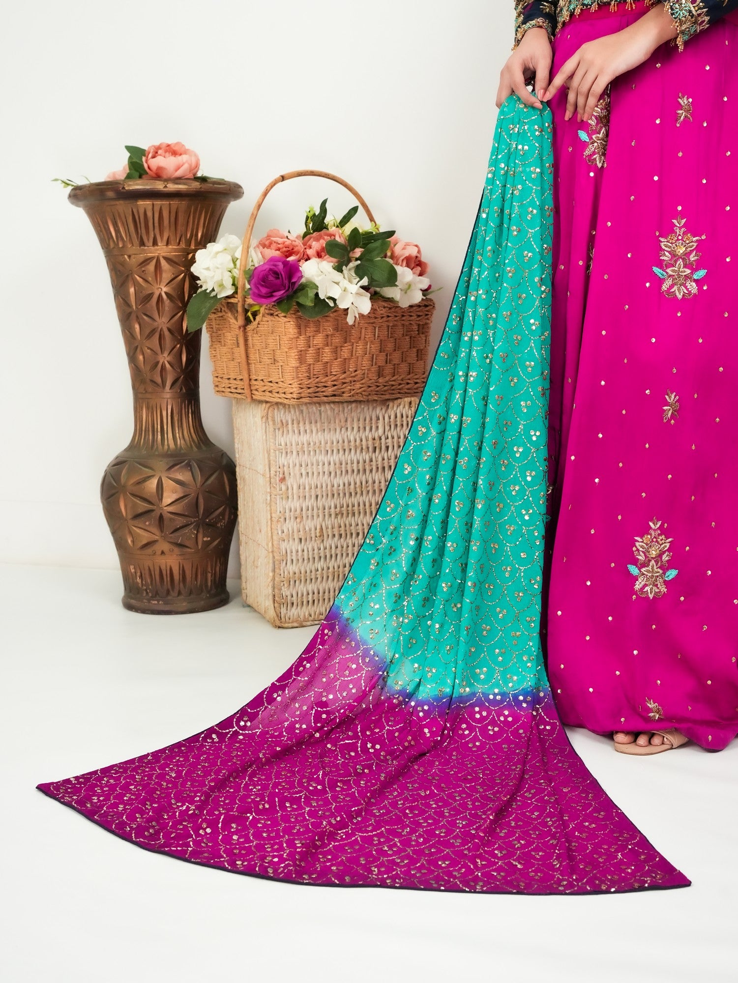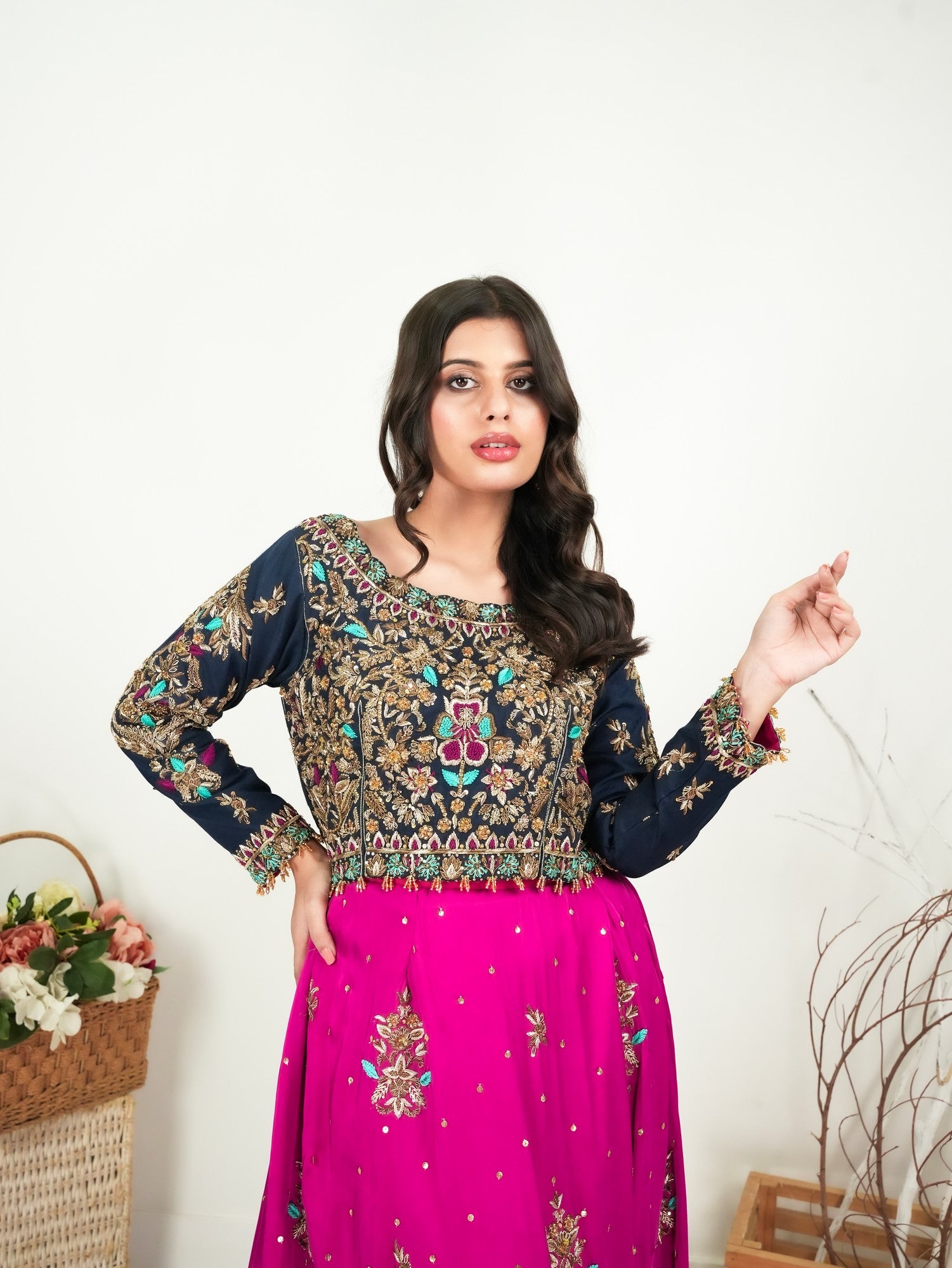 Step into vibrant luxury with our Fuchsia Pink Glamour Dress, an exquisite ensemble that combines vivid colors and intricate designs. The deep fuchsia base is beautifully contrasted by bold golden and navy-blue embroidery, giving the dress a rich, royal flair.