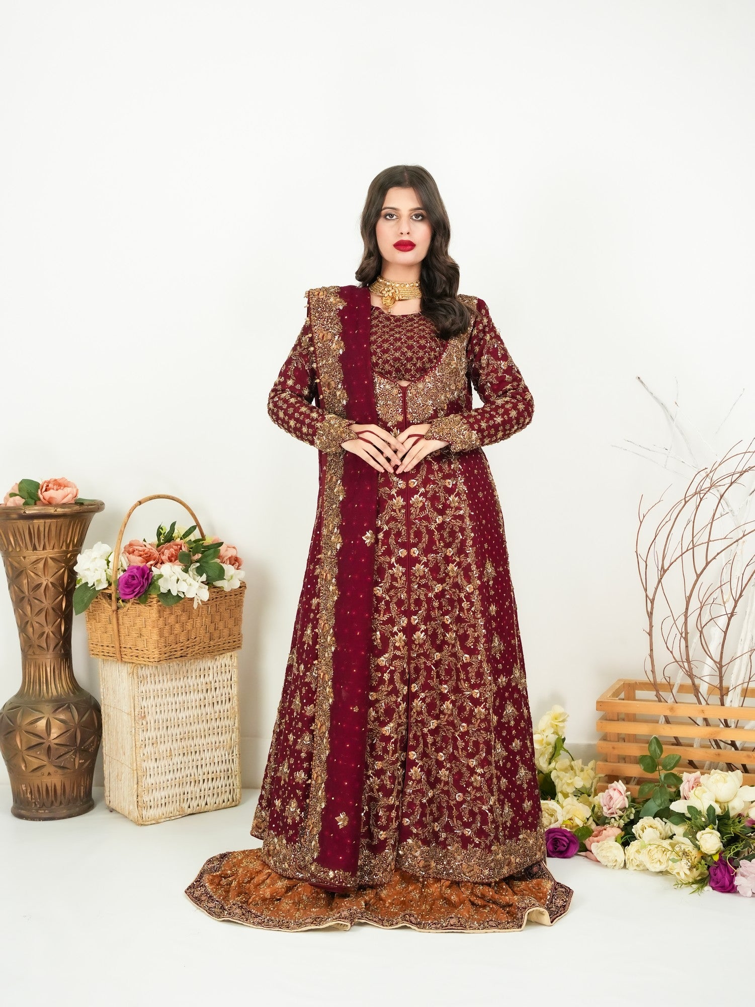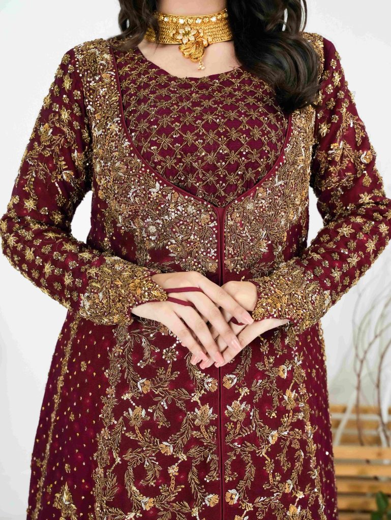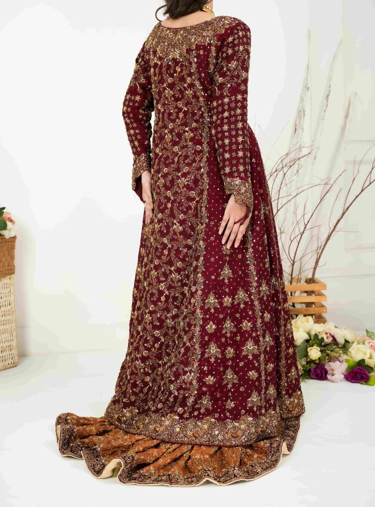 Presenting the Grand Crimson Bridal Ensemble, a masterpiece designed for the bride who seeks to exude royalty on her special day. This striking crimson attire is meticulously embellished with intricate gold embroidery, blending traditional craftsmanship with contemporary elegance. The ensemble’s rich crimson color is accentuated by ornate patterns that enhance its opulent appeal. The outfit is complemented by a matching dupatta, intricately detailed to complete the look. Perfect for weddings and high-profile events, this ensemble ensures you radiate confidence and grace.