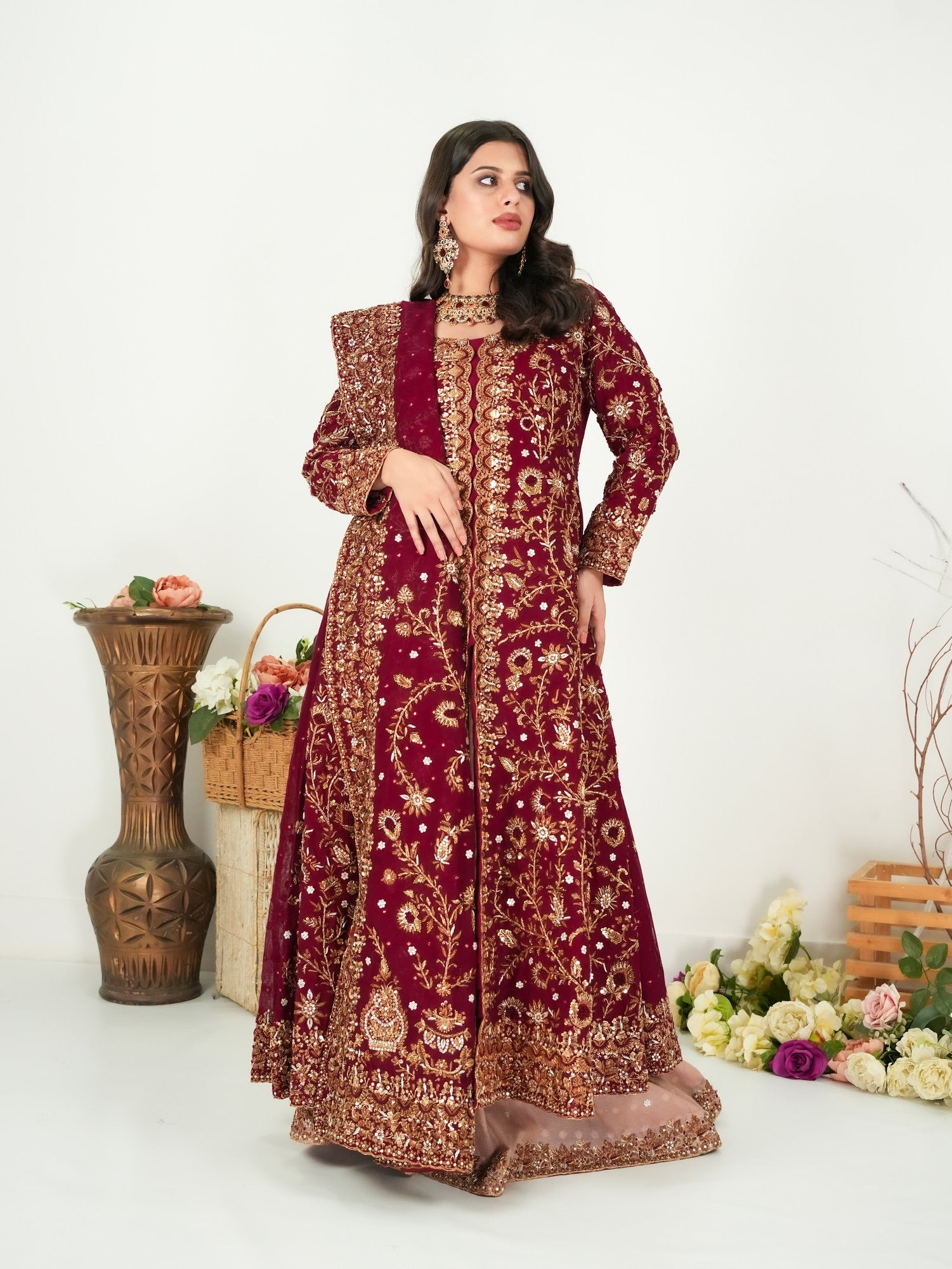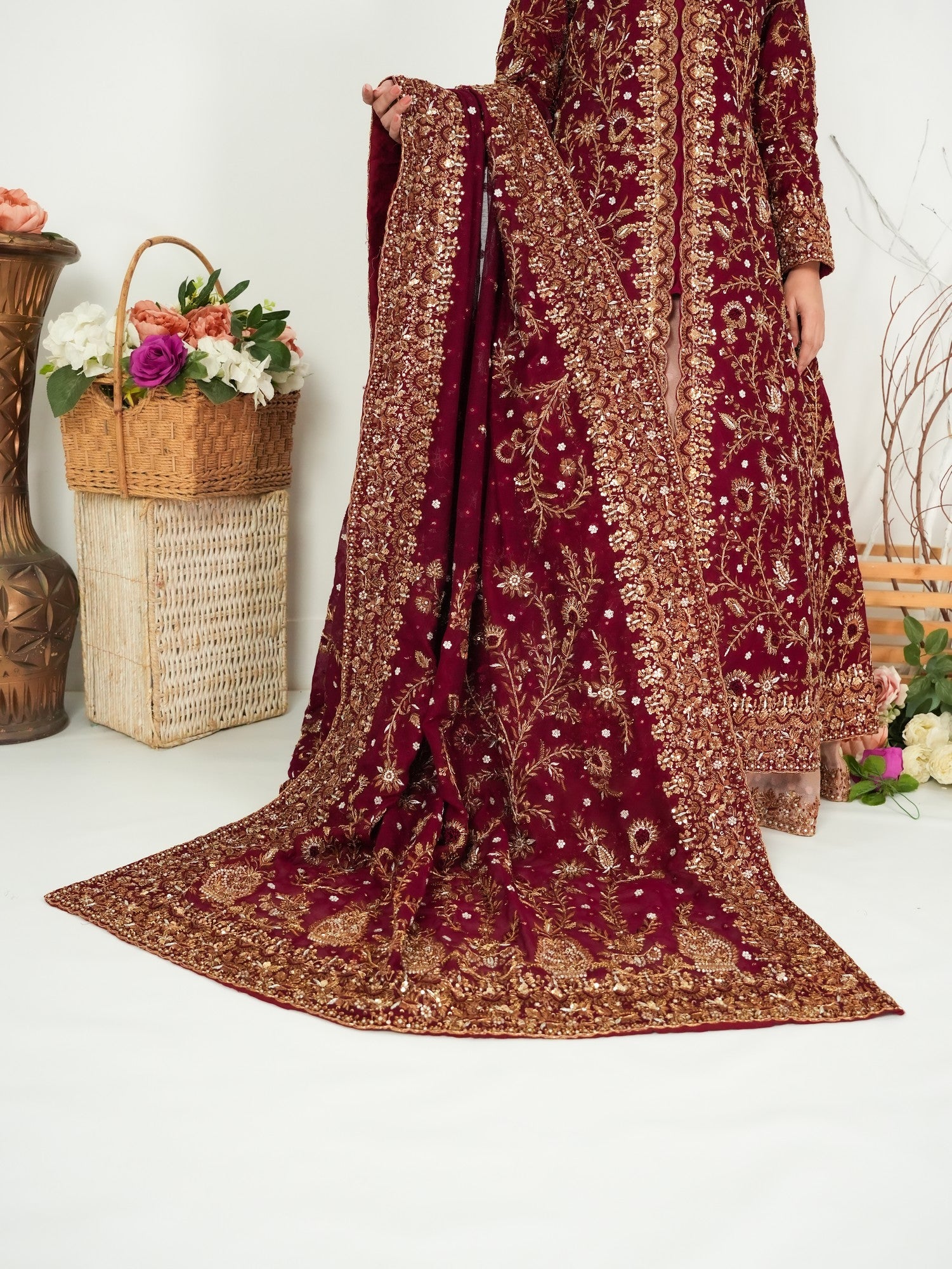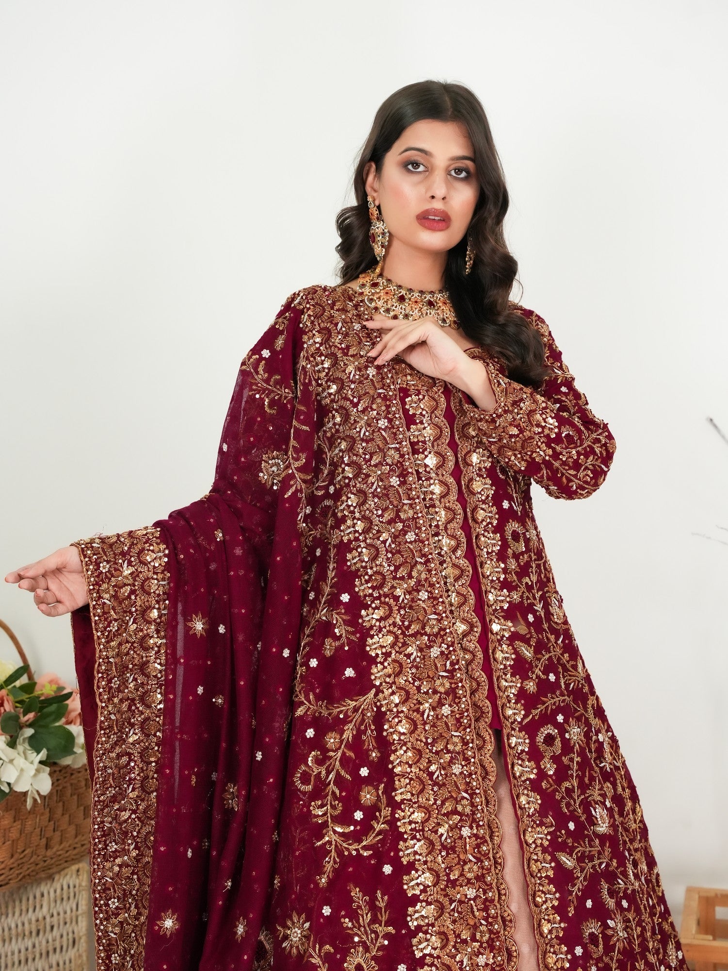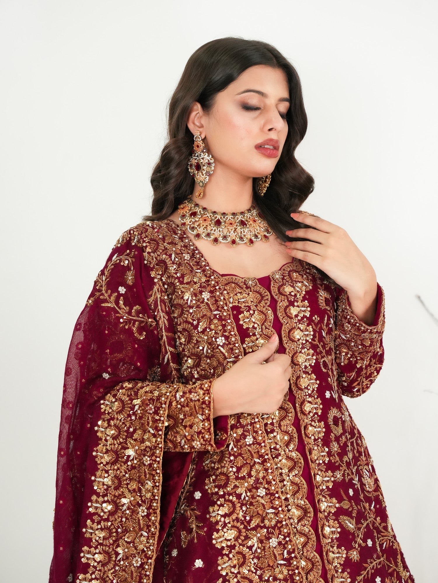 Introducing the Opulent Maroon Bridal Ensemble, a stunning creation that encapsulates grandeur and tradition. This exquisite maroon outfit is adorned with elaborate gold embroidery, showcasing a harmonious blend of floral and geometric patterns that bring out the richness of the fabric. The deep maroon hue adds a touch of sophistication, making it a perfect choice for brides who wish to embody royal elegance on their special day. The ensemble includes a finely detailed dupatta, complementing the outfit’s luxurious design. Ideal for weddings and grand celebrations, this bridal attire ensures you make a timeless statement.